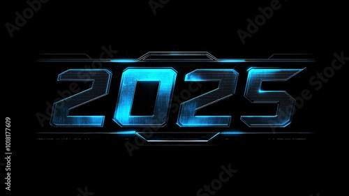The text "2025" in a beautiful blue neon light, the technological structure of the chips and the glow of the contacts.