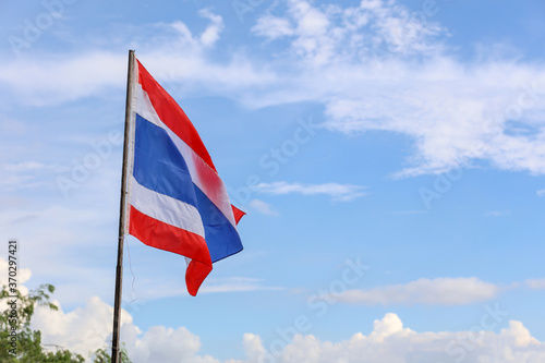 The thailand flag on wood pole have sky background