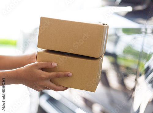 The torso of a delivery man delivering a cardboard box,Human hand is sending a box of materials
