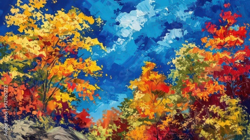 The vibrant hues of fall foliage create a striking contrast with the deep blue of the sky