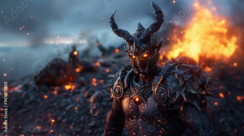 The warrior, clad in ornate armor with glowing eyes, surveys a volcanic landscape filled with molten rock and fiery debris as the sun sets, creating an intense atmosphere