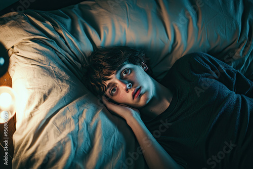 The Weight of Insomnia: A Young Man's Struggle to Sleep in a Blue-Lit Room