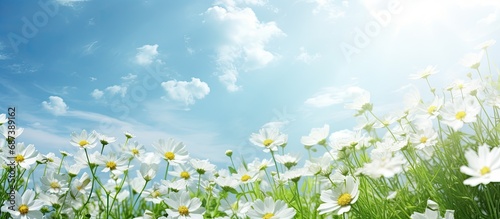 The white flowers bloom beautifully under a bright sun and green sky.