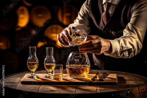 The winemaker is tasting the whiskey. Hands of a man and a glass of whiskey against the background of wooden oak barrels. AI generated.