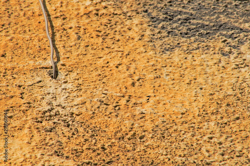 The wire comes out of a yellow concrete wall