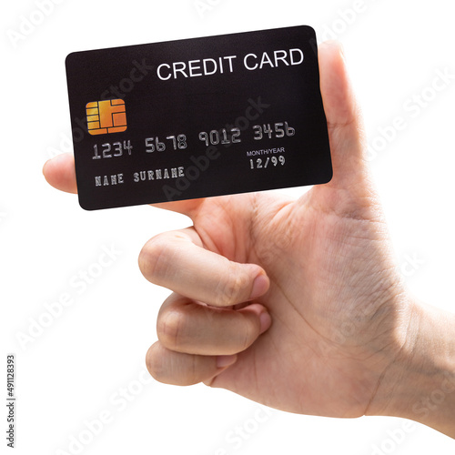 The woman's hand holds a black credit card isolated on white background..