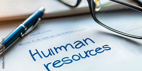 The word "human resources" is written on a white piece of paper using a pen, with a pair of glasses nearby, generative AI