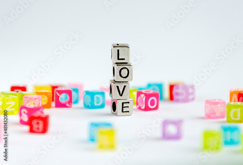 The word LOVE laid out in silver cubes among colored