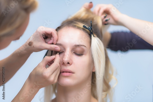 The work of a professional make-up artist, beautician, makes makeup on the face of a blonde girl with shadows on the eyes.
