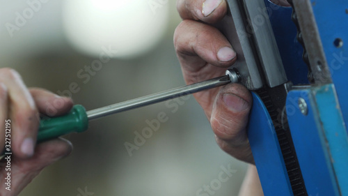 The worker screws the part with the key in milling machine