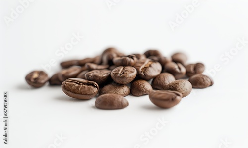 There are some coffee beans on a white background in the photo. The photo was taken with a Canon EOS camera and has high resolution and bright colors. It is a style of commercial photography with a cl