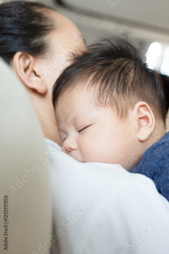 there is a baby sleeping on a woman ' s lap