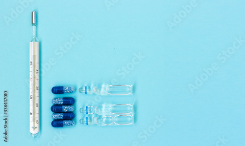 Thermometer, pills, injection ampoules for vaccination on a blue background, healthcare coronavirus, cancer, painand treatment, pharmaceutical medicine concept .
