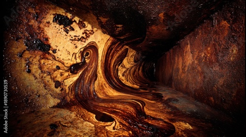 Thick crude oil with rich brown swirling patterns and textures, showing viscous liquid flow