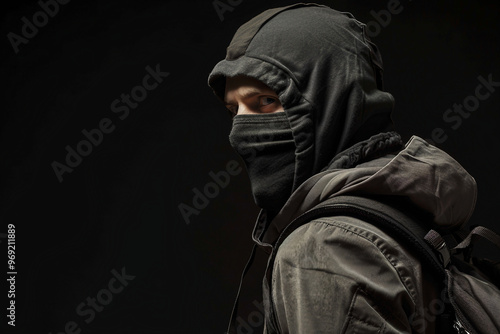 Thief in black clothes criminal action shop lifting street violence citizen robbery, Generative AI