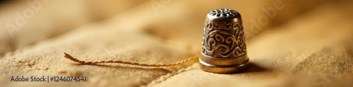 Thimble with needle and thread on light tan fabric, handmade, quilt