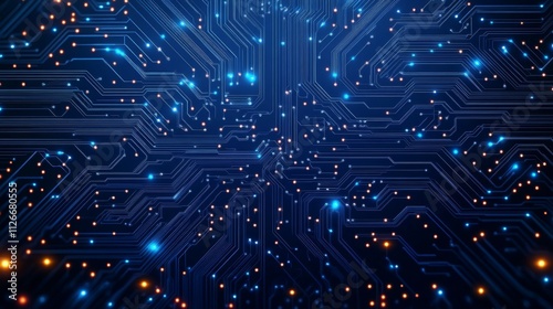 Thin circuit trace lines in blue on a dark technology background. Abstract digital tech background