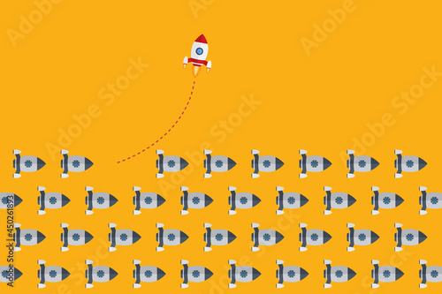 Think differently concept. Red rocket changing direction.