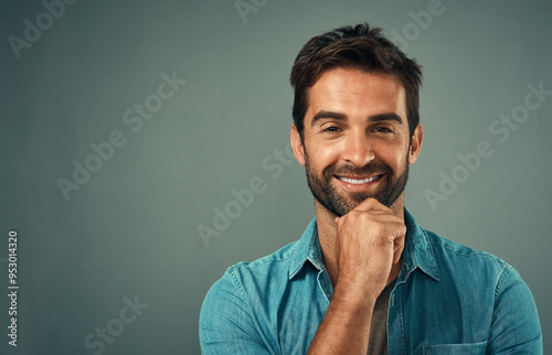 Thinking, business man and portrait with smile for problem solving, project ideas and brainstorming reflection. Planning, employee and happy with solution or contemplation on studio background mockup