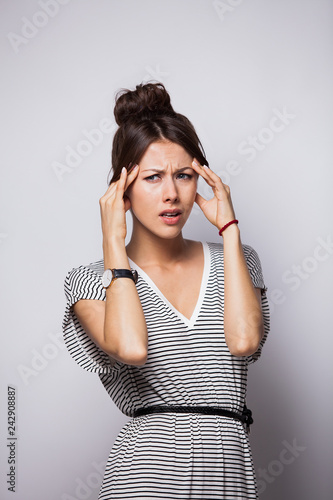 Thinking, tired or ill with headache young woman, isolated over white background.