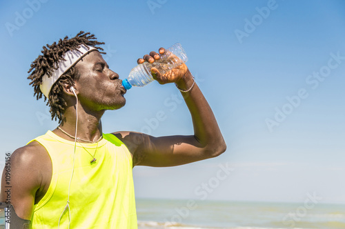 Thirsty attractive athletic african man drinking fresh water after workout