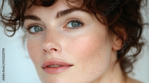 This close-up portrait features a woman with curly hair and freckles, showcasing her natural beauty and expressive gaze. The soft lighting enhances her serene and youthful appearance.