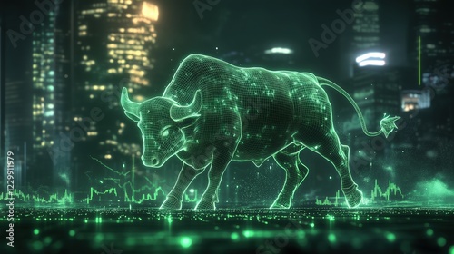 This digital art piece features a glowing green bull symbolizing the bullish cryptocurrency market, set against a futuristic cityscape and trading data. The neon, 3D elements emphasize the financial g