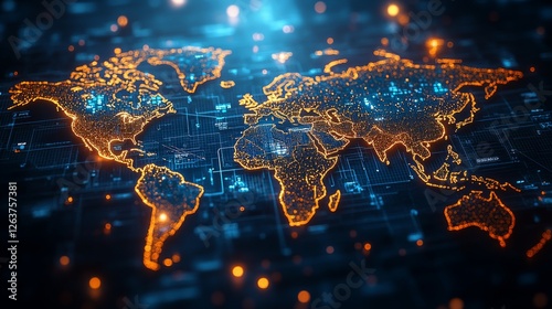This image depicts a glowing world map against a technological backdrop, representing the interwoven connections and data flow that span across the globe.