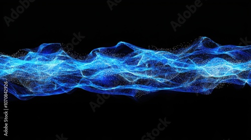 This image showcases flowing blue waves against a black background, creating a vibrant and dynamic visual effect with particles.