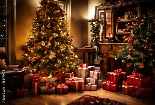 This is a beautifully arranged Christmas tree and presents in a living room