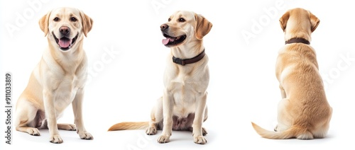 This is a collection of three dogs, a happy labrador set (portrait, sitting and standing) isolated on white background as transparent PNGs, generating using stock.