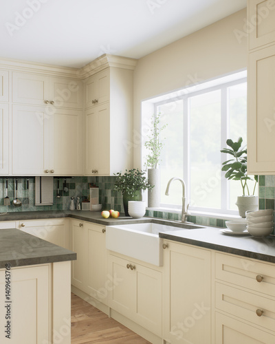 This is a stylish and modern kitchen, decorated with beautiful green accents and an open layout