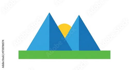 This is a vibrant and stylized illustration showcasing a graphic representation of a landscape featuring two stylized mountains, a yellow sun, and a green base, all presented against a clean white...