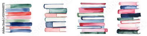 This png image showcases a watercolor stack of books, distinguished by their vibrant and varied covers, arranged in a fanciful manner against a transparent background