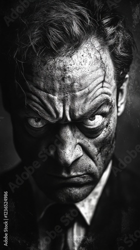 This striking black and white portrait showcases a man with intense emotions captured through a dramatic expression, revealing deep inner turmoil and resilience.