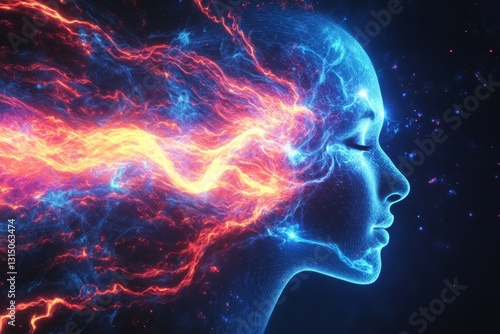 This stunning abstract digital artwork depicts a human silhouette, with vibrant energy flowing from its head, symbolizing creativity and transformation.