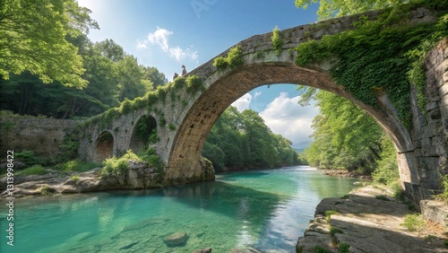 This stunning image features an ancient stone bridge arching gracefully over a crystal-clear river.