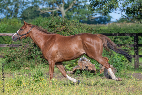 Thoroughbred racehorses enjoying summer turn out in the fields, galloping around for fun and letting off steam.