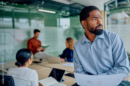 Thoughtful african american businessman holding documents, looking away during an office meeting with diverse colleagues in the background