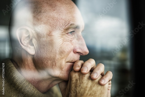 Thoughtful elderly man looking out window with hands clasped reflecting on memories in natural soft daylight