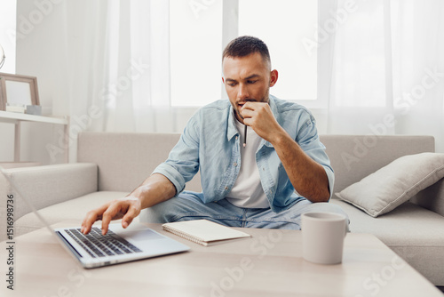Thoughtful man working on a laptop at home, focusing on his task while sitting comfortably on a sofa. Natural light creates a warm and inviting atmosphere.