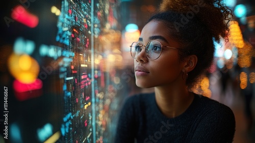 Thoughtful young woman looking at illuminated data wall at night.
