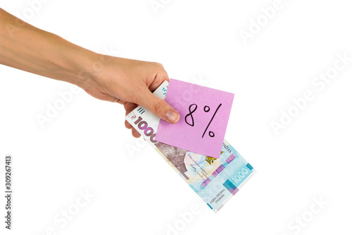 Thousand hryvnias and sticker with different financial signs and symbols in the hand