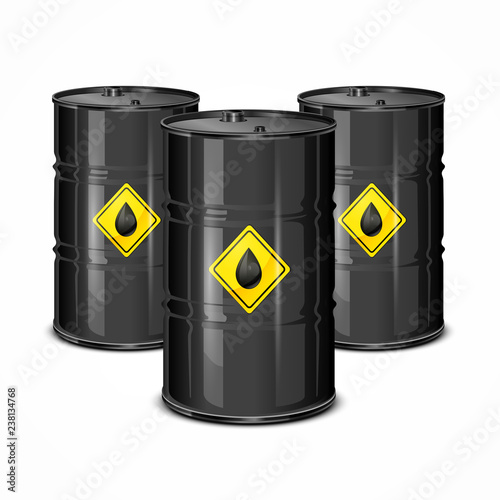 Three 3d crude oil barrels with yellow label, isolated on white.