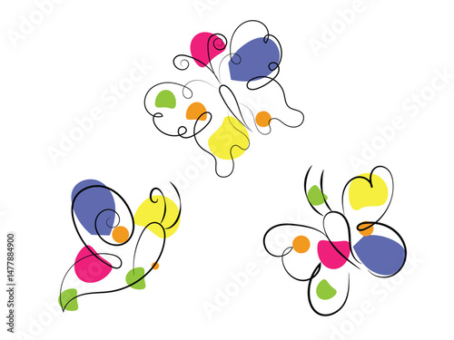 Three Abstract Butterflies Line Art Design Colorful Shapes White Background