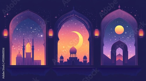 Three arched windows view moon, sky, and building.