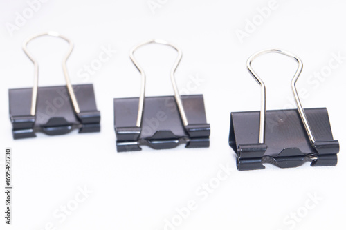 Three Black Binder Clips on a White Background, Office Supplies, Paper Organization, Close-up View.