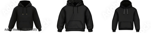 Three black hoodies displayed isolated on white or transparent