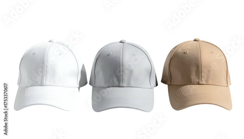 Three blank baseball caps, white, gray, and tan, sit in a row against a black background