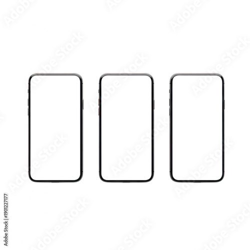 Three blank smartphone screens with black borders displayed side by side on a white background. isolated on transparent background